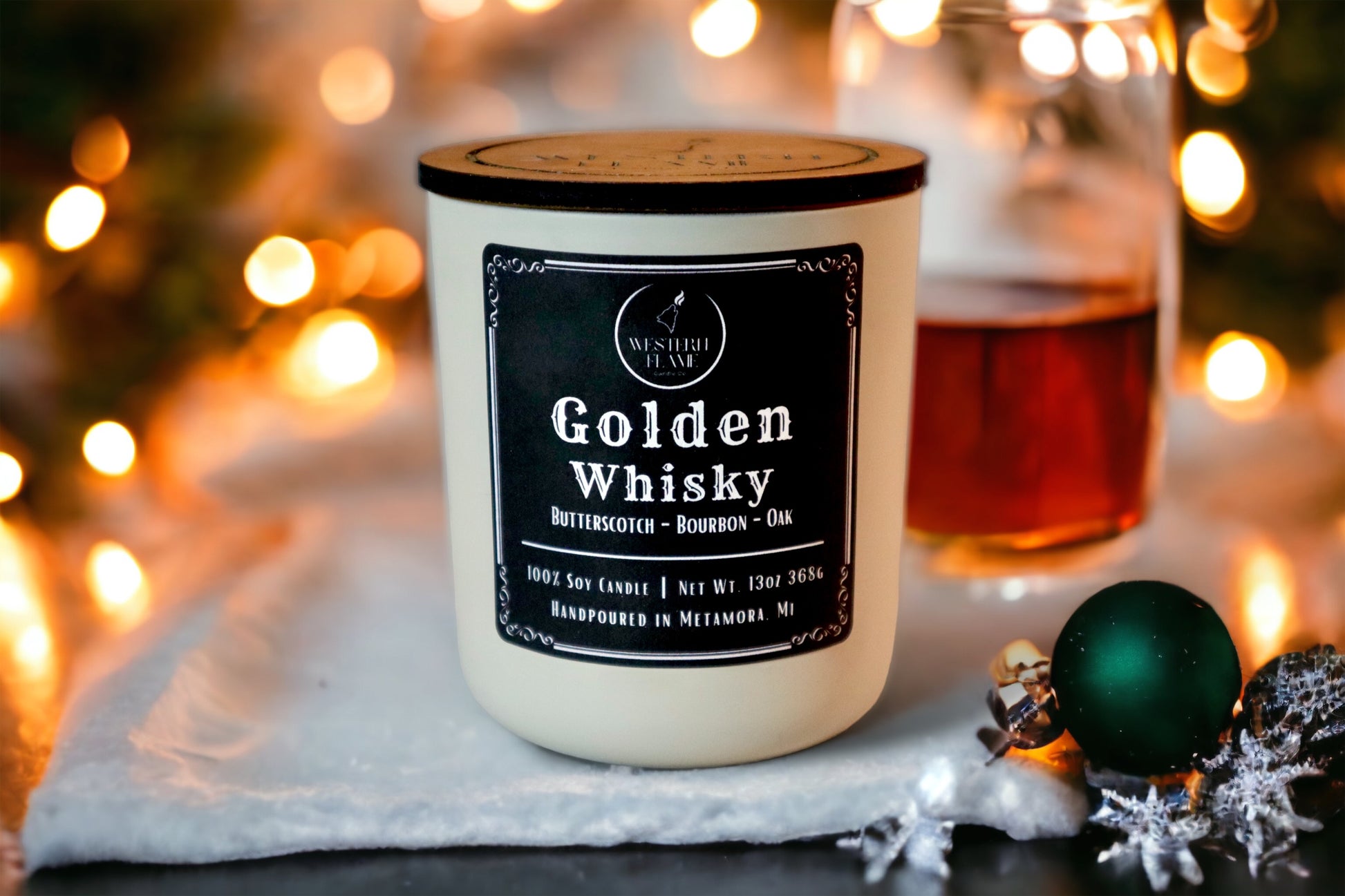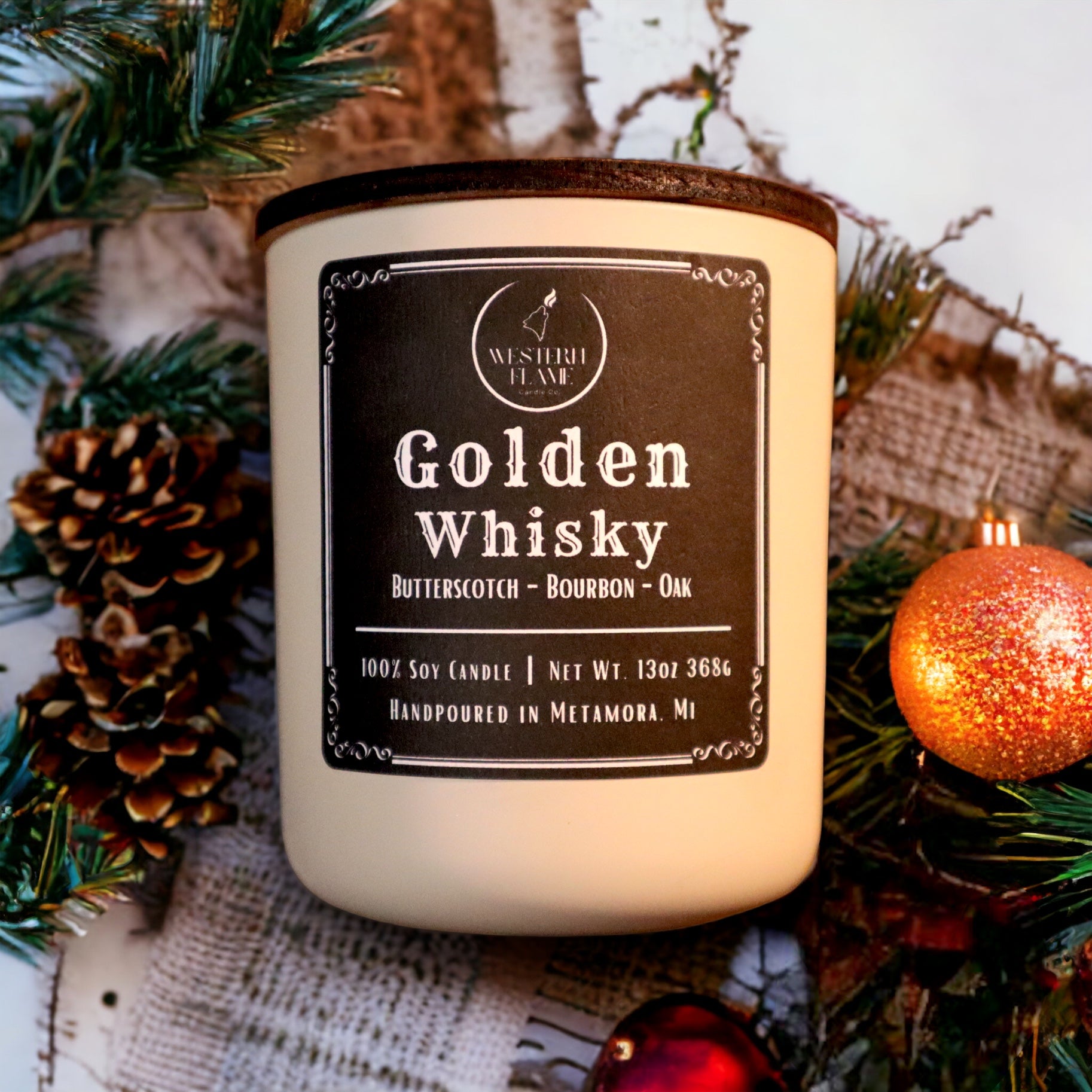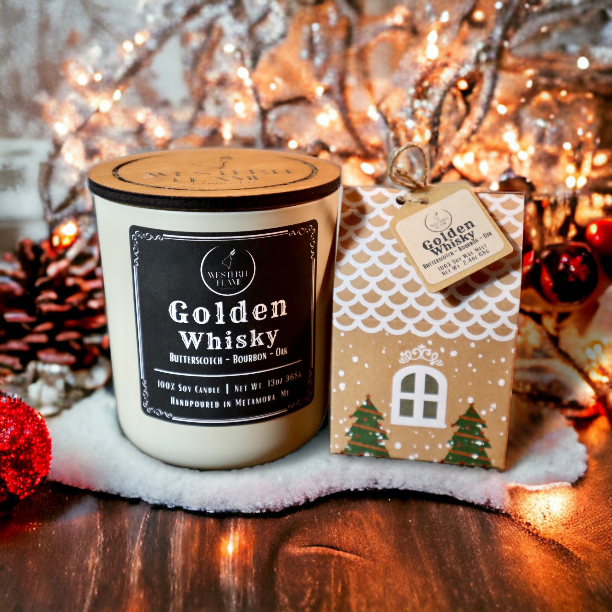 Whether you're a city slicker yearning for a taste of a cowboy winter or a true western aficionado, the Golden Whisky Christmas candle is a trailblazing choice. Let the enchanting blend of butterscotch, bourbon, and oak transport you to a time when the wild west met the festive season, and create memories as lasting as a cowboy's grit. Saddle up, light 'er up, and embrace the frontier spirit this holiday season!